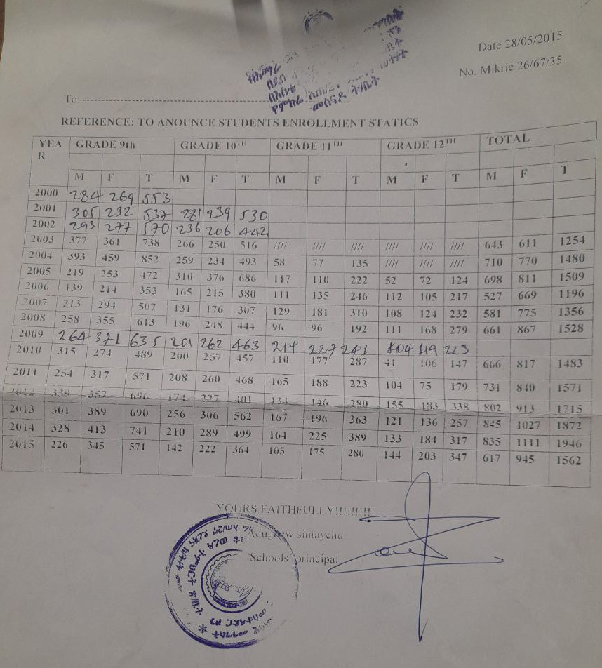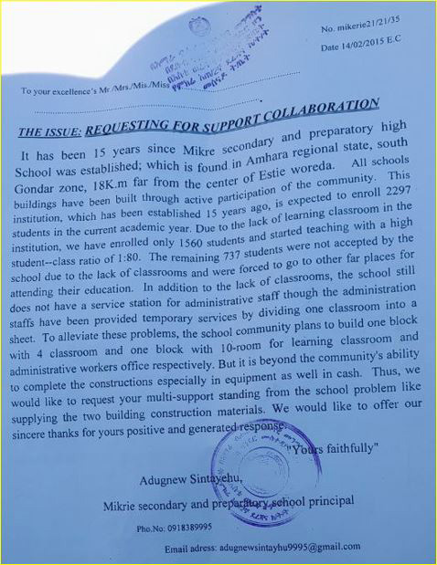 Hier ist der original Brief von Schulleitung der Sekundarschule Mekerie aus Äthiopien mit Unterschrift und Stempel vom 05.02.2023 (Der äthiopische Kalender hinkt dem gregorianischen Kalender sieben bis acht Jahre hinterher).