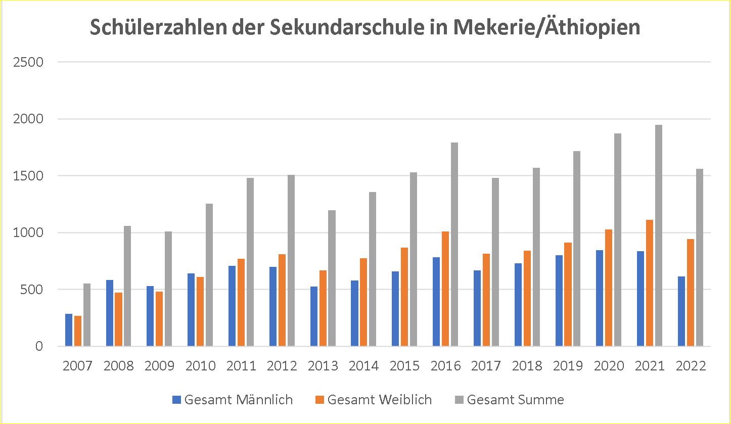 Gegenwärtig werden in der Schule Mekerie über 5600 Schülerinnen und Schüler unterrichtet. In jeder Klasse sind 100 bis 120 Schüler, die sich zusammen in dunklen und engen Räumen aufhalten. Während der Regenzeit sind alle Räume sehr feucht. Die Schüler kommen aus weit entfernten Orten Barfuß und in kaputter Kleidung über Schotter und Steine in die spartanisch eingerichtete Schule, meist ohne Frühstück und einige von ihnen aus bis zu 30 Km Entfernung gelaufen. Trotz der Vielzahl der Schülerinnen und Schüler ist es immer ruhig in den Räumen und es geht sehr diszipliniert zu. Die Schülerinnen und Schüler sind freundlich miteinander - auch wenn sie unterschiedlichen Religionen angehören. Gewalt an den Schulen gibt es nicht. Aber sie wünschen sich Stühle, Tische, Lehrmaterialen, mehr gut ausgebildete Lehrerinnen und Lehrer, mehr Gebäuden für die Klassen 9 und 10, denn nur dann können sie einen Schulabschluss erwerben. Es gibt Schüler, die schon 25 Jahre alt sind. Sie mussten einst die Schule abbrechen, weil sie die Eltern auf dem Feld brauchten. Jetzt wissen sie, wie wichtig Bildung ist und wollen unbedingt einen Schulabschluss machen. Hier in Mekerie ist der große Bildungshunger der äthiopische Jugend erlebbar.